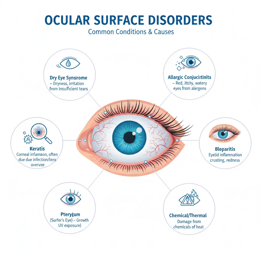 Ocular surface disorders disturb the delicate balance of moisture, clarity, and protection on the front of the eye. Effective treatment begins with understanding the root cause—dryness, infection, allergies, inflammation, or injury.