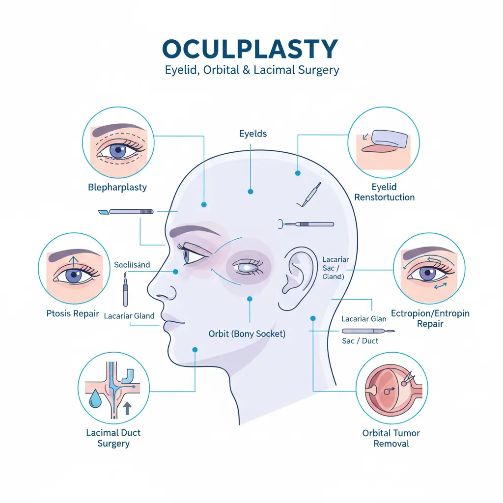 Oculoplasty—often called eye plastic and reconstructive surgery—is a specialised field of ophthalmology dedicated to restoring the health, function, and aesthetics of the structures around the eyes. It addresses conditions affecting the eyelids, tear drainage system, eye sockets, brows, and surrounding facial tissues.